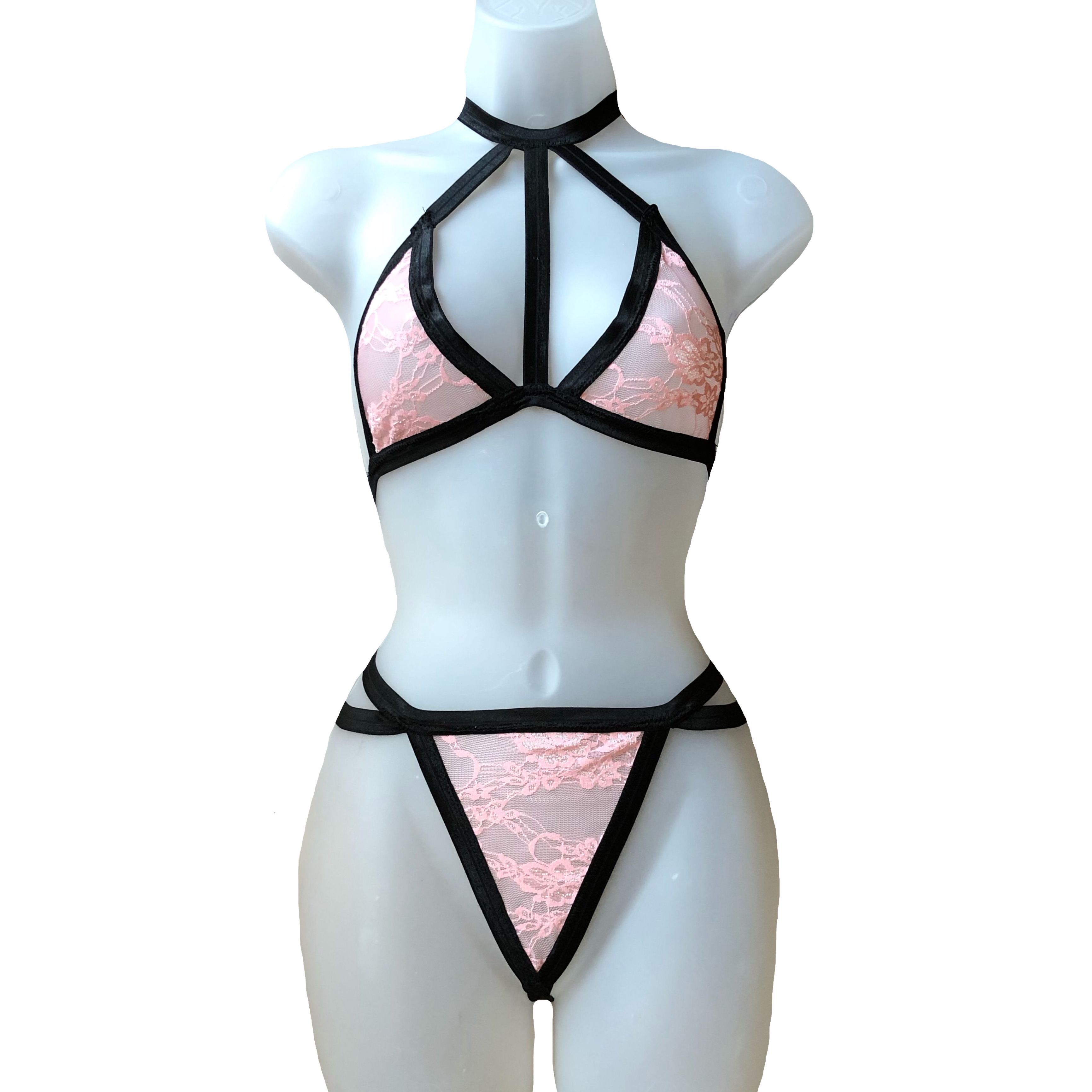 Soft and stretchy set made out of a beautiful floral lace in the cutest blush pink shade! Features a Harness style front as well as attached choker. Lounge around the house in this set or wear it any day!