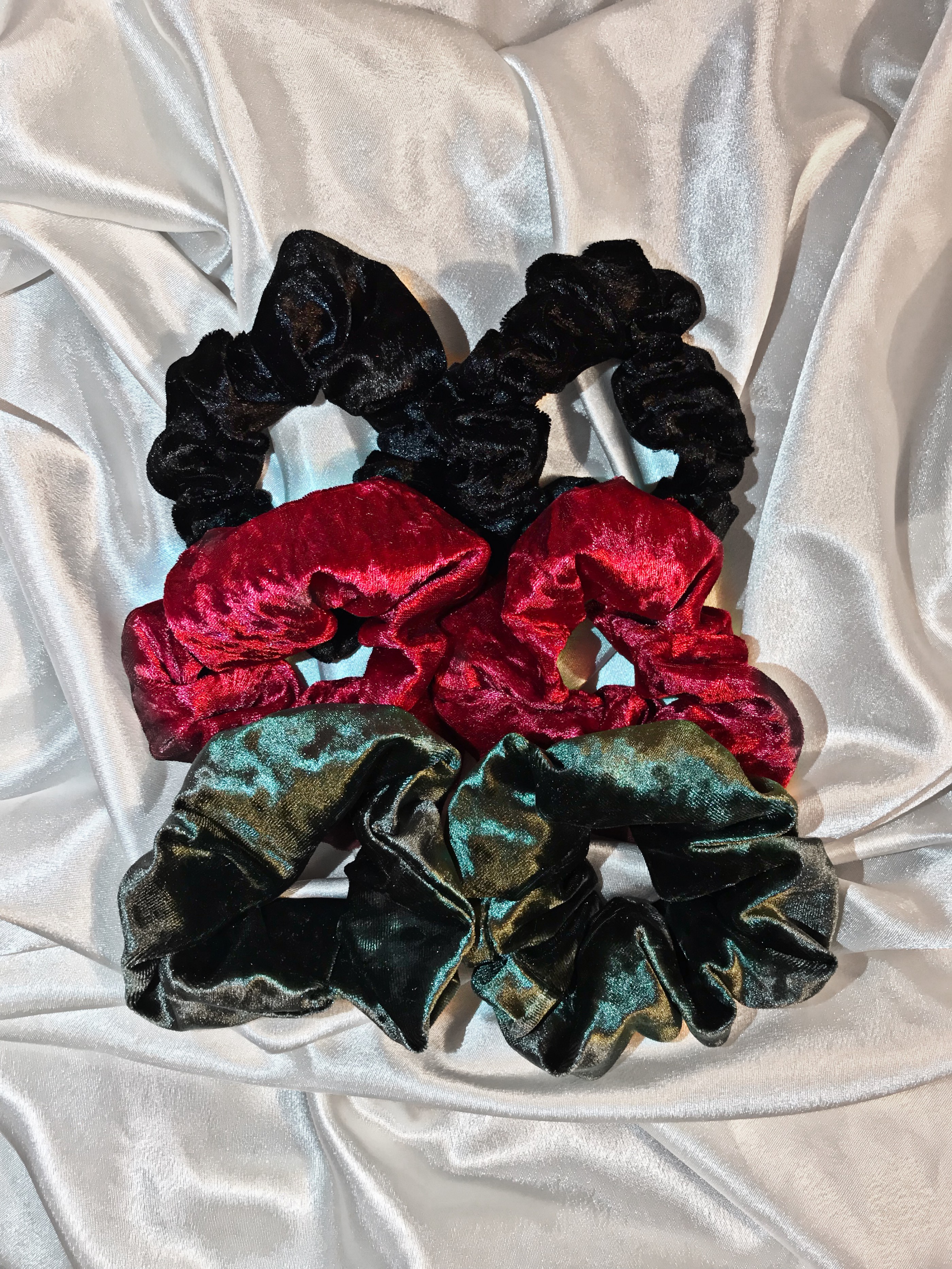 This bundles is a 6 piece set of RANDOM, DARK colored Velvet Scrunchies! Colors may vary. Examples are: Olive Red Black Silver Royal Purple Burgundy Navy Blue Etc.
