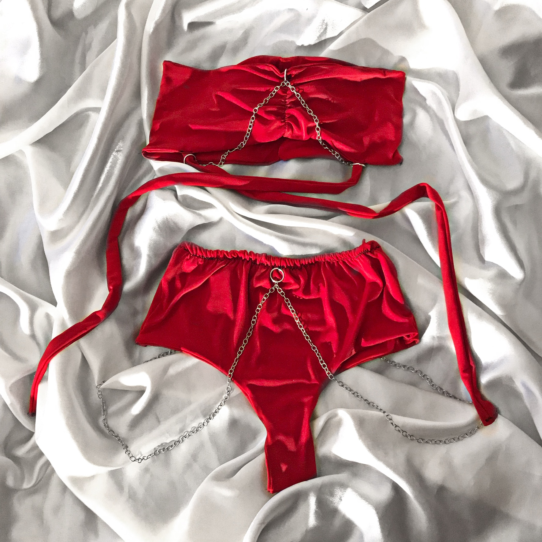 This bikini is made out of a polyester blend fabric. Very stretchy and soft. Features a chain harness on the bra as well as a double chain on the bottoms. Bottoms are a high rise thong cut. Perfect set for when you want to stand out at the beach.