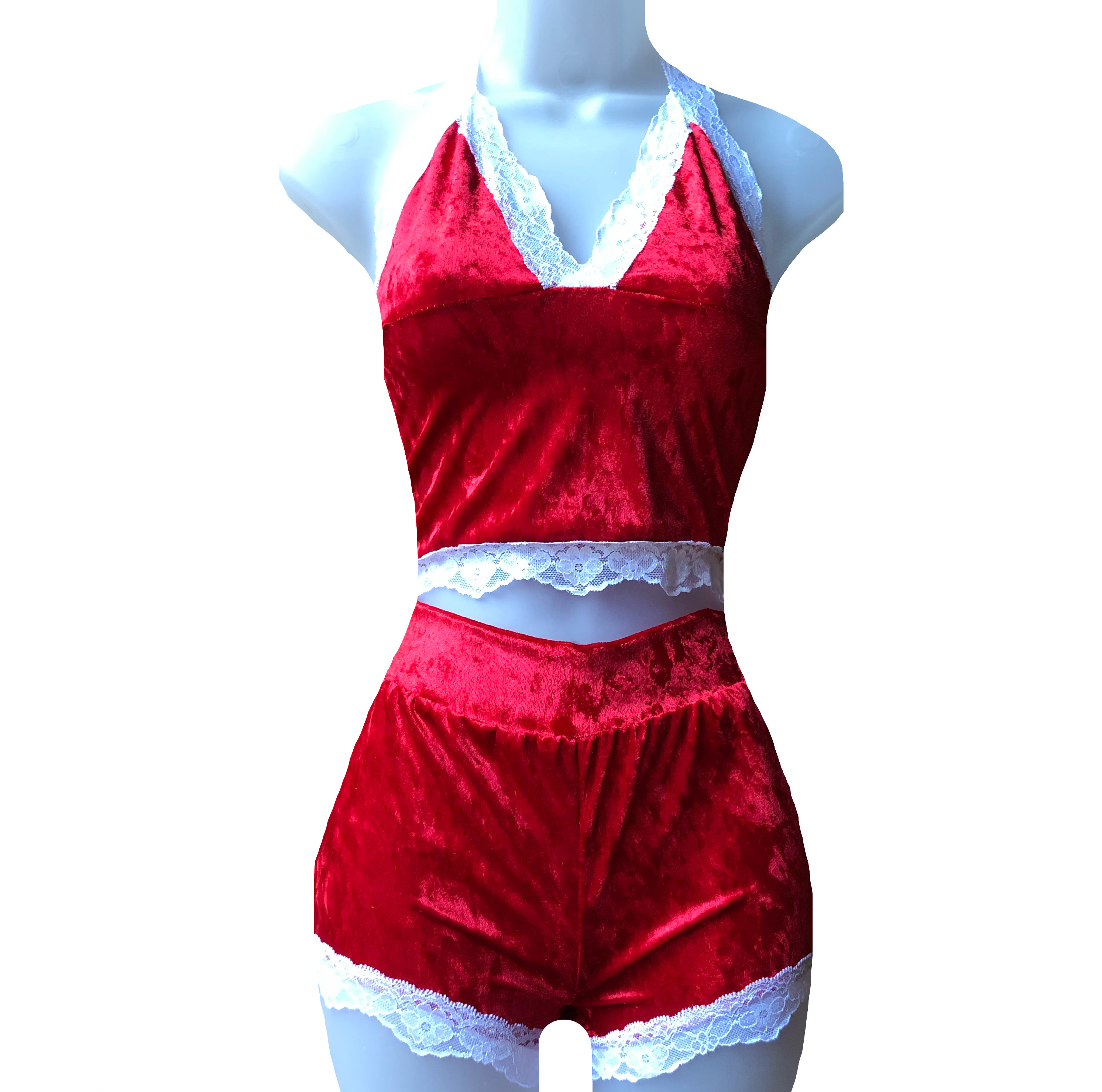 This set features a soft red velvet & lace trim around the edges. Top can be worn as a crop top & shorts are a boy/booty short cut! Made in a comfy panne velvet. Stretchy and very comfortable.