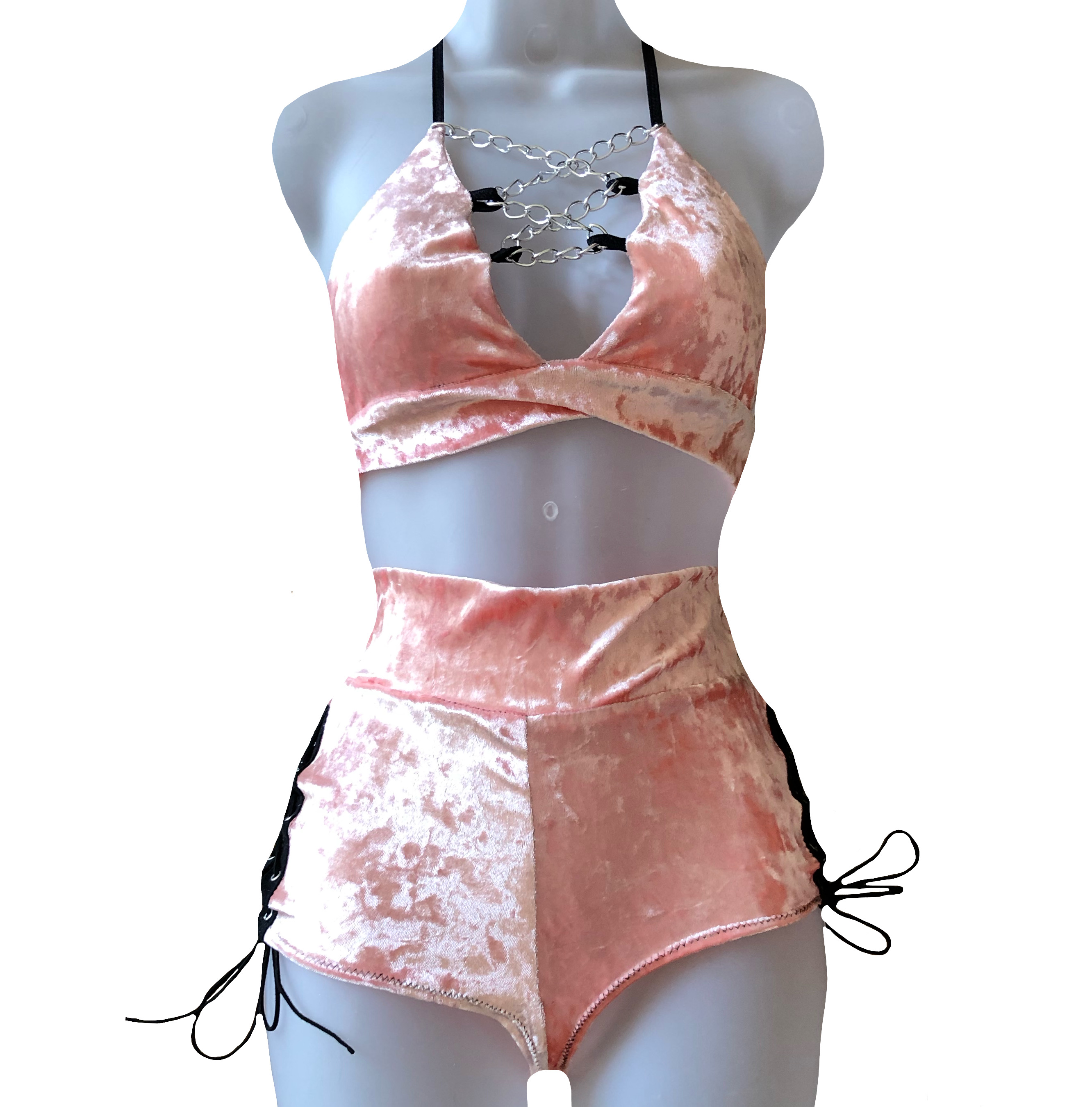 Matching set made out of a soft panne velvet fabric. Bralette lace up details created by chains. Shorts are xtra cheeky and lace up on both sides up to the waistband.