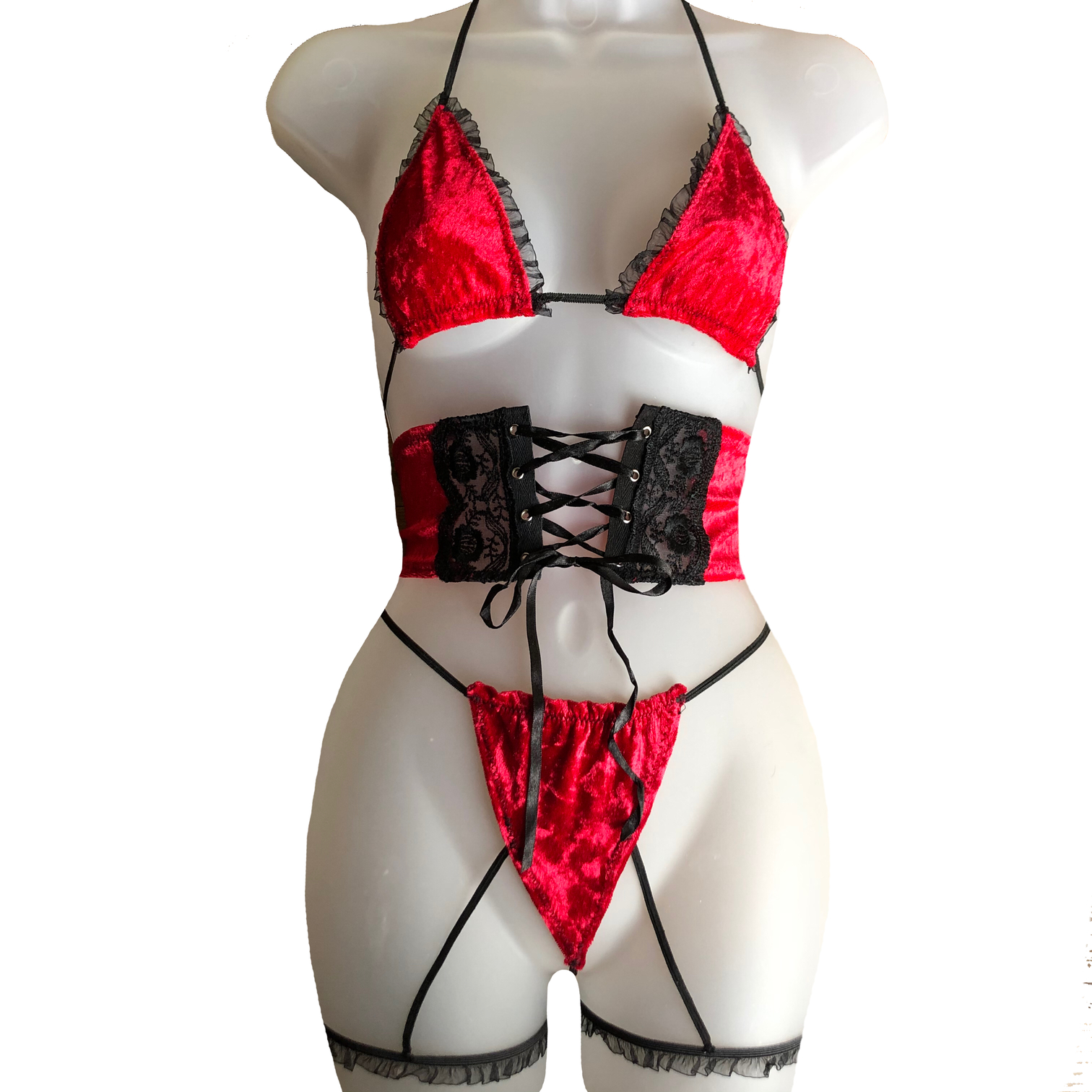 Set made out of a soft and stretchy velvet material. 3 pieces total, all bands are stretch material and the corset is 100% adjustable. Gstring bottoms.