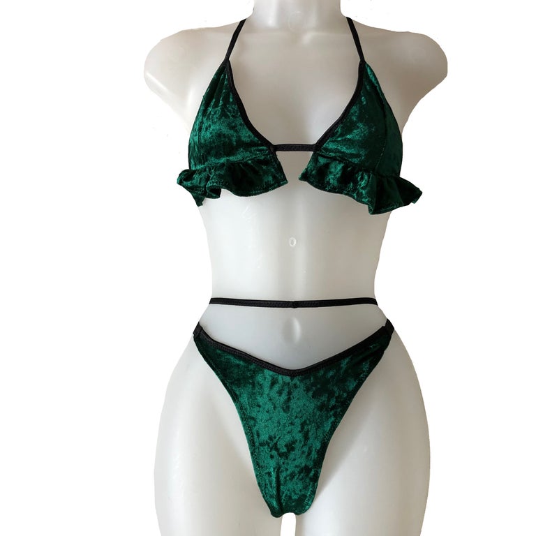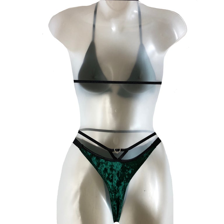 Set made out of a soft and stretchy velvet material. All bands are stretch material. Thong bottoms.