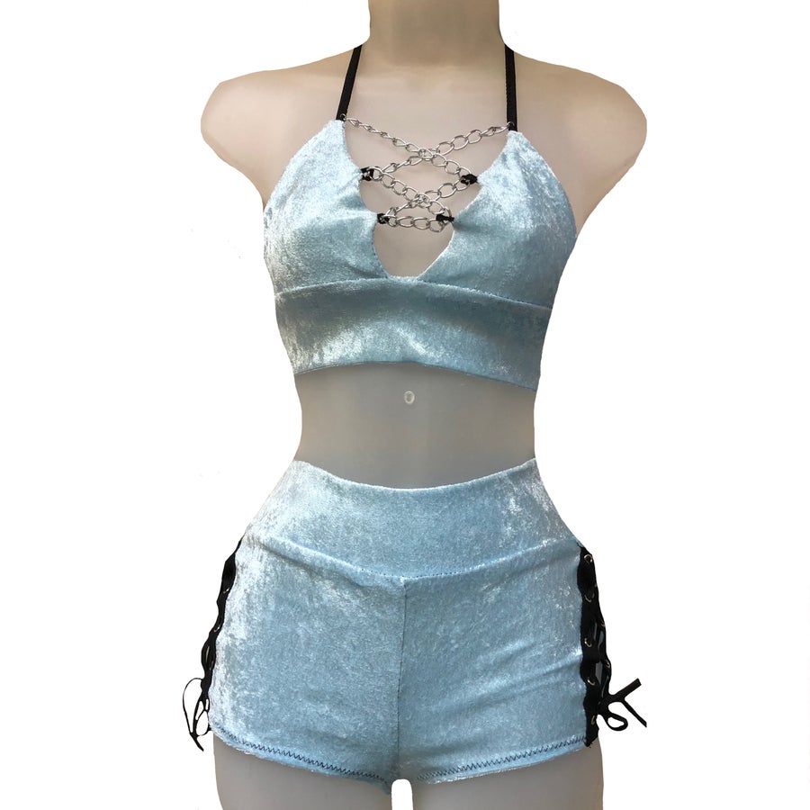 Matching set made out of a soft panne velvet fabric. Bralette lace up details created by chains. Shorts are xtra cheeky and lace up on both sides up to the waistband.